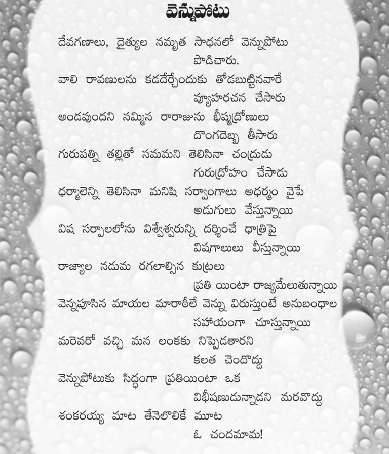 విషయ సంగ్రహం : పురాణాలలోని పాత్రల్ని, సంఘటనల్ని నేటి జీవన విధానానికి ముడిపెడుతూ జీవనవిలువలు, వ్యక్తిధర్మం, కుటుంబధర్మం, సామాజిక ధర్మాలను మంచీచెడుల మధ్య వ్యాత్యాసాన్ని సూచిస్తూ జాతిజనుల ముందుకు తీసుకువచ్చిన కవితలు ఇవి... పాఠక దేవుళ్ళ ఆశీర్వచనాలు లభిస్తాయనే నమ్మకంతో...